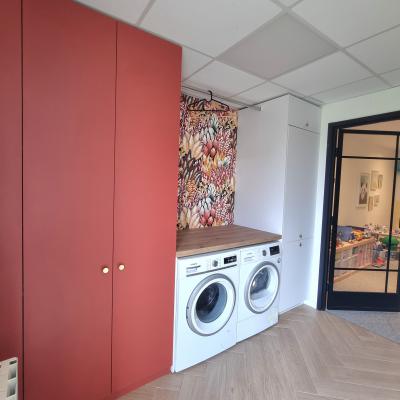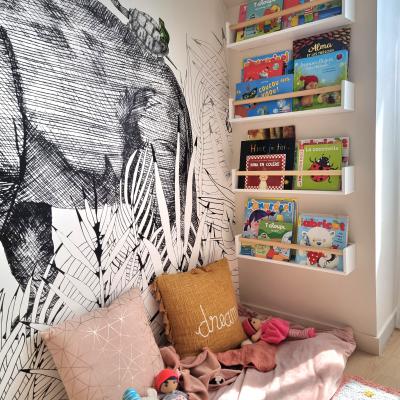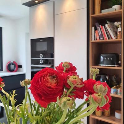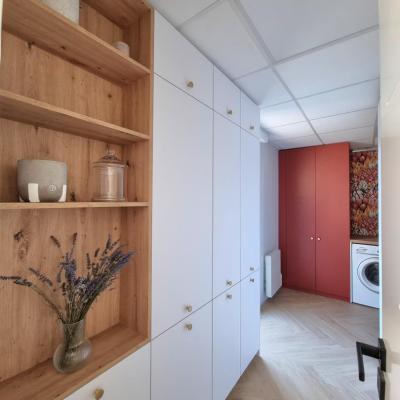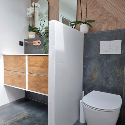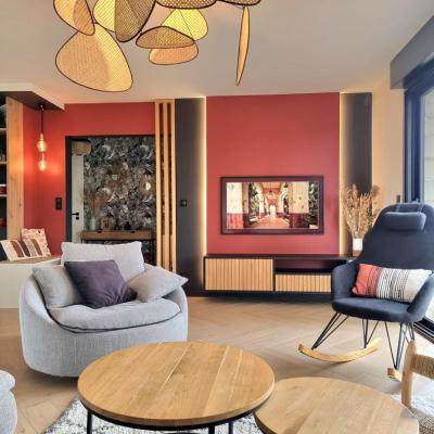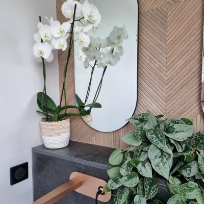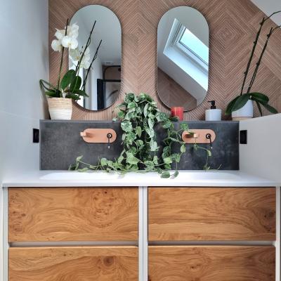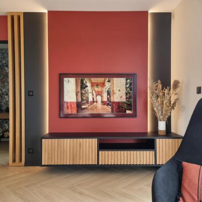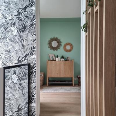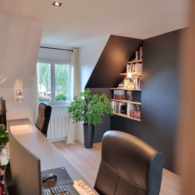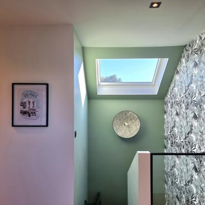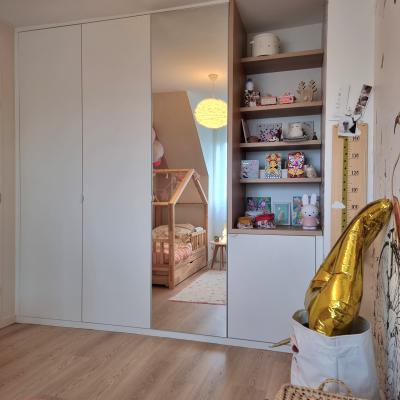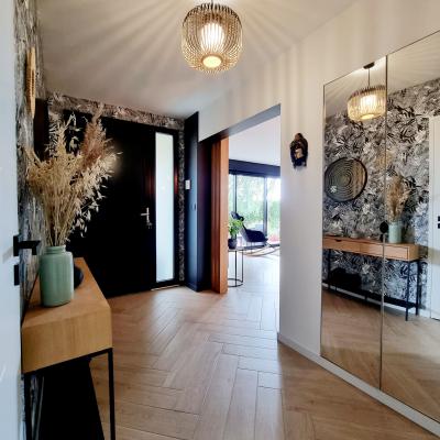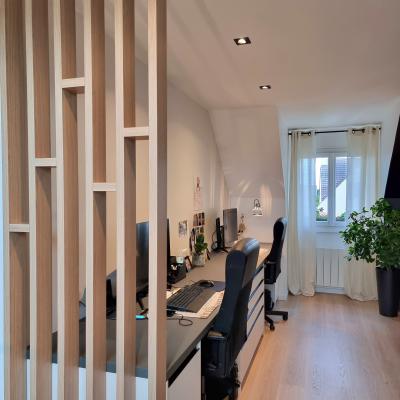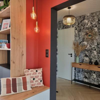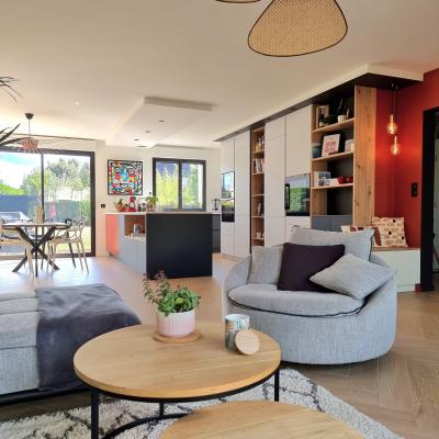Le projet a été conçu comme un tout, avec un fil conducteur qui traverse chaque espace. Des matériaux contemporains, des couleurs à la fois marquées et douces, une atmosphère fluide et chaleureuse : chaque pièce a été pensée pour s’intégrer harmonieusement dans l’ensemble. L’agencement a permis d’intégrer de nombreux rangements sur-mesure, de créer une arrière-cuisine avec buanderie, de transformer l’ancien garage en salle de jeux évolutive pour leur fille, et de structurer un espace bureau confortable avec deux postes pour le télétravail. Les chambres ont également été optimisées, tout comme les deux salles d’eau qui ont été entièrement repensées.