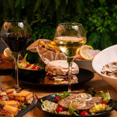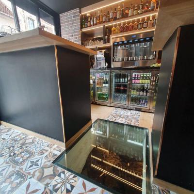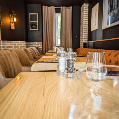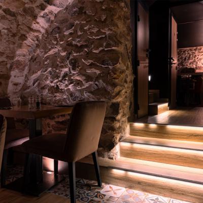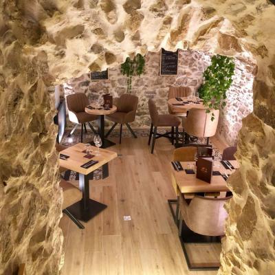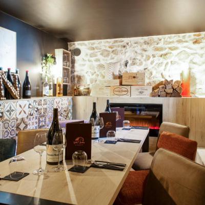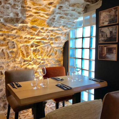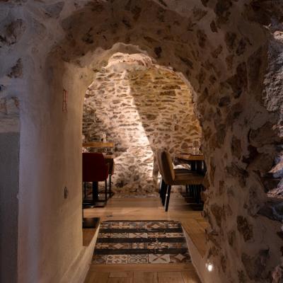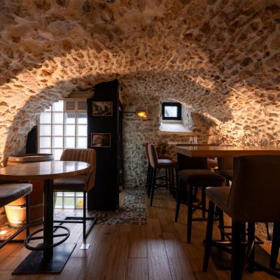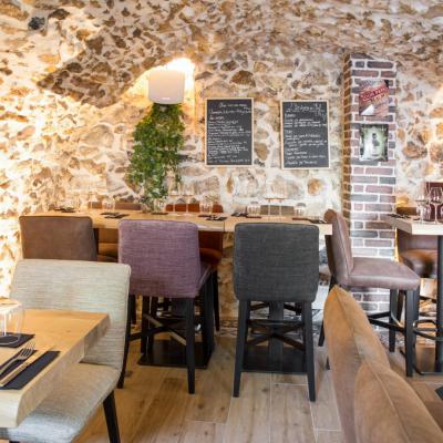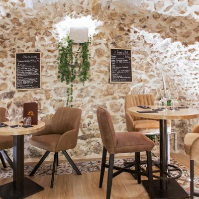 Le restaurant se développe sur deux niveaux : un rez-de-chaussée accueillant, structuré autour des zones de service et de dégustation, et un sous-sol voûté en pierre, entièrement rénové, qui donne au lieu une atmosphère unique, presque confidentielle. Ce niveau bas, avec ses volumes authentiques, apporte chaleur, caractère et intimité à l’expérience proposée.