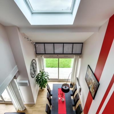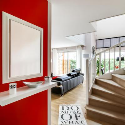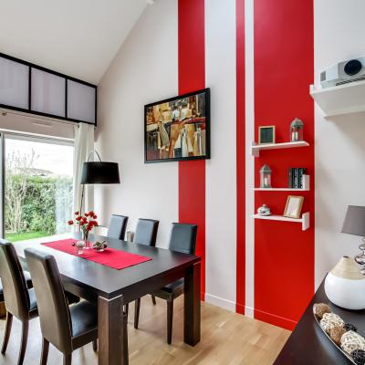 La palette colorée souhaitée par nos clients était audacieuse : marron et rouge, deux teintes fortes, peu courantes ensemble, mais qu’ils tenaient à intégrer. Le défi a été relevé avec subtilité et équilibre, grâce à un travail précis sur les nuances, les matières et les rythmes verticaux. Les bandes rouges verticales viennent souligner la hauteur cathédrale du séjour, accentuant la sensation de volume et de verticalité tout en apportant une touche théâtrale parfaitement dosée.