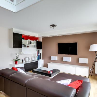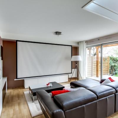 Pour ce projet, nos clients nous ont confié l’aménagement complet de leur séjour, avec une envie bien particulière : faire de leur salon un véritable cocon cinématographique, où l’expérience visuelle et le confort se conjuguent au quotidien.