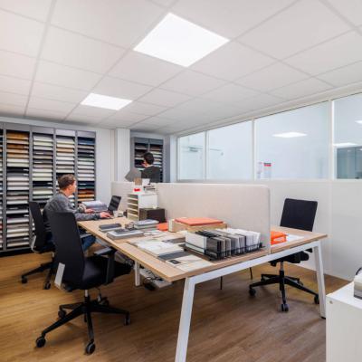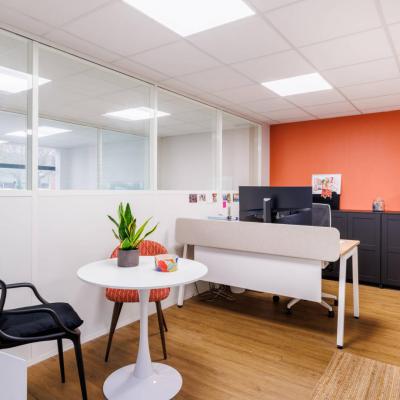 L’enjeu principal était de créer des espaces distincts par pôles d’activités — secteur privé, secteur public, appels d’offres… — tout en conservant une circulation fluide et une cohérence globale. Le cloisonnement a été travaillé avec finesse, grâce à l’intégration de parties vitrées en hauteur, qui permettent de préserver la luminosité naturelle, d’ouvrir les perspectives, tout en assurant l’intimité nécessaire au travail en équipe.
